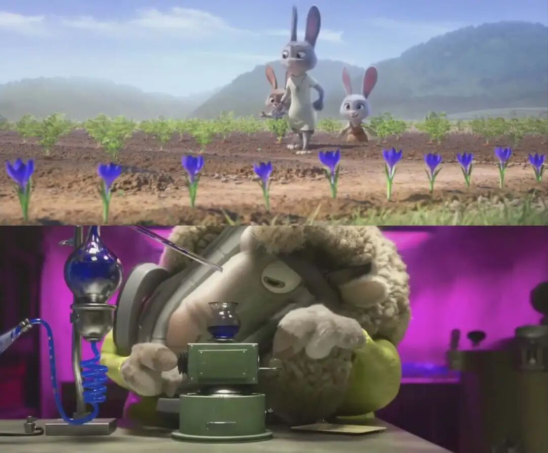 比如紫色。在《猖獗动物城》里,一种名为“午夜嚎叫”的紫色花朵潜藏剧毒,肉食动物误食便会野性大发,极具抨击性。将其索取加工后,还能制成雷同呈紫色的液态毒药,被邪派用来制造动物城的心焦。