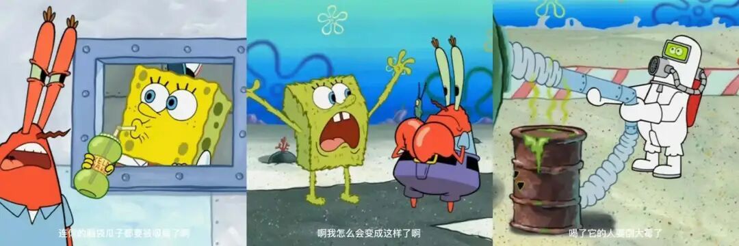 《海绵宝宝》中曾出现过一款绿色的海草汁饮料,海绵宝宝、蟹雇主等东说念主喝了之后径直变成了“绿毛怪”,内部“喝了它的东说念主要倒大霉了”的台词更是径直讲明这种绿色饮料有毒。