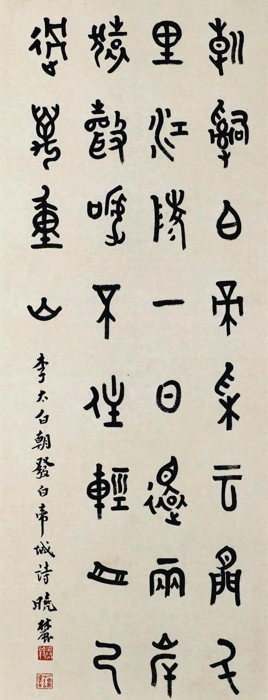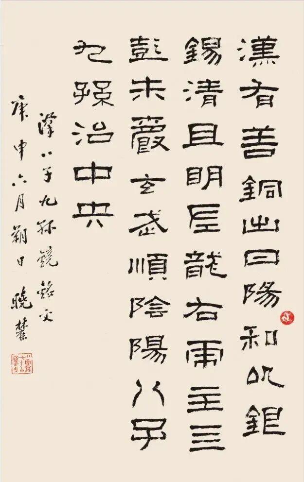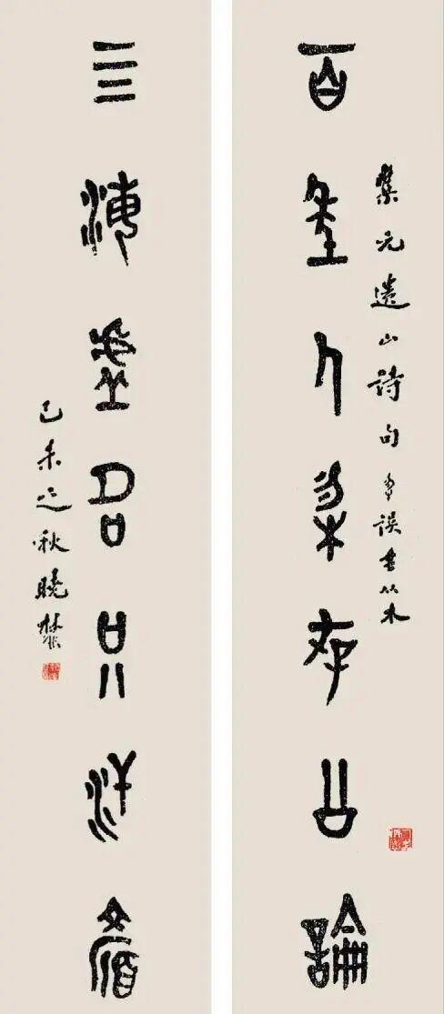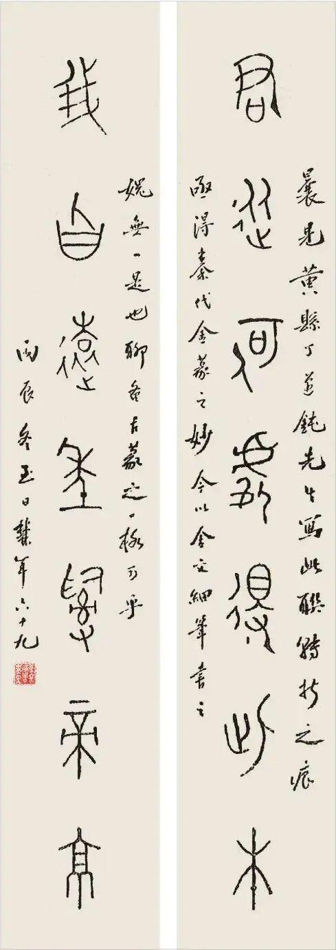 其篆书结字纵势,字轴线垂正,要点稍高而支点均衡,汜博中见领略。因德高艺弘、学深功厚、襟怀散落,书格雅境高、意婉韵朗。往时其获一等奖作品被评委颂赞 “钟鼎楹联笔力凝重,慎重汜博,行款妥帖,甚具功力”,可谓一语中的。